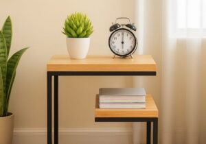 Mesa de luz industrial de madera maciza y hierro negro de doble nivel | Valhalla Hym