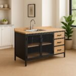 Bajo mesada de estilo industrial fabricado en madera maciza, hierro negro y puertas de metal desplegado. Incluye cajones amplios y espacio para bacha.