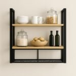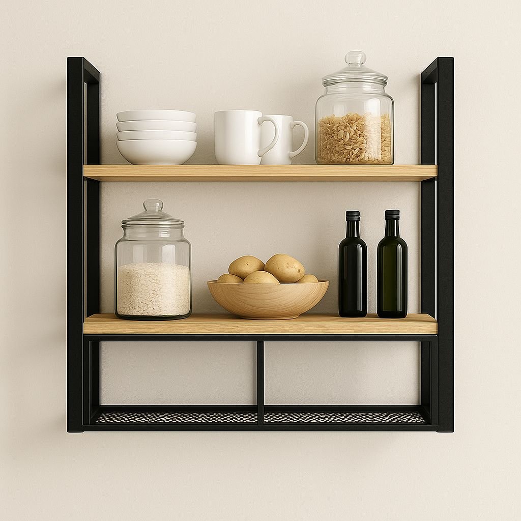 Nuestra estantería aérea de cocina en hierro y madera combina funcionalidad y diseño industrial en una sola pieza.
