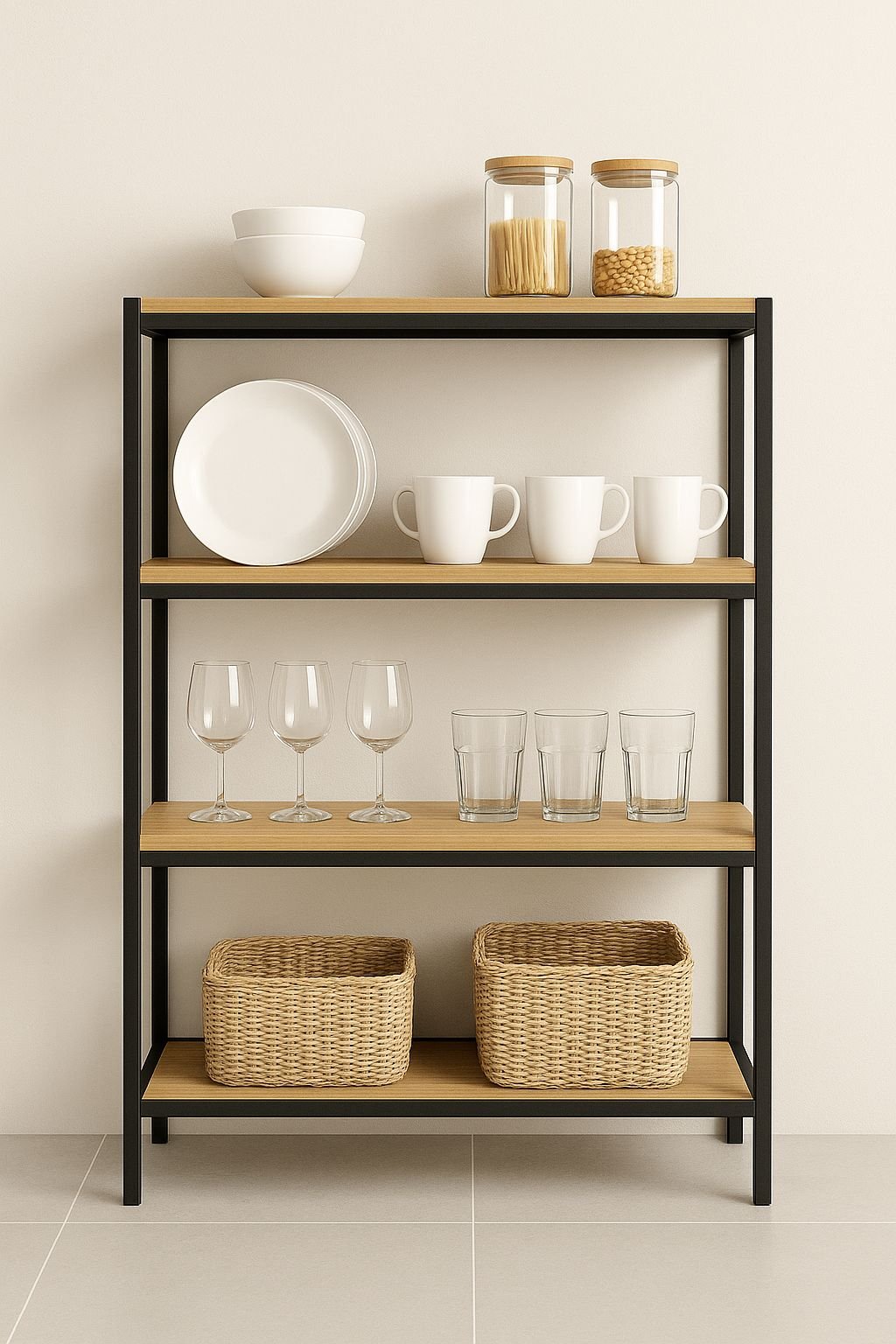 Sus 4 niveles permiten organizar vajilla, frascos, utensilios, decoración o incluso textiles en cestos, adaptándose tanto a cocinas como a livings, comedores o baños.