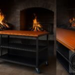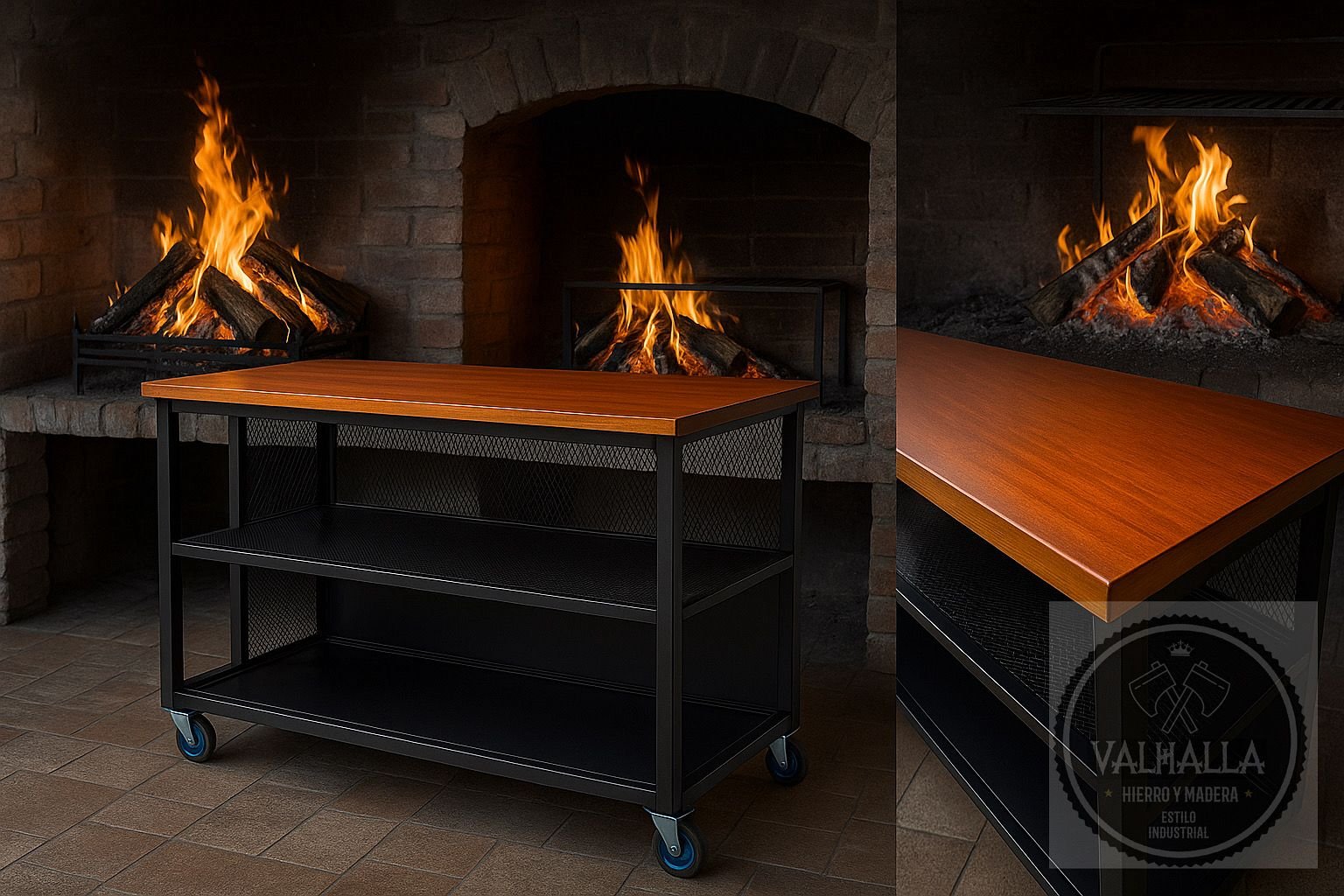 Isla de cocina multifuncional con estructura de hierro, estantes en metal desplegado y tapa de madera maciza. Incluye ruedas para fácil traslado, ideal para quinchos, cocinas y parrilleros.