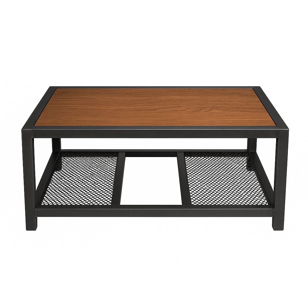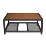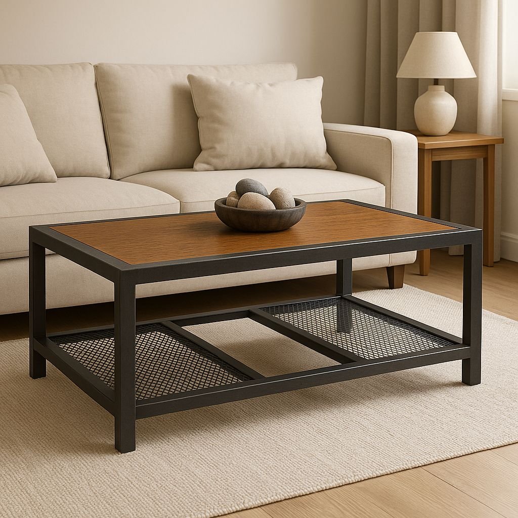 Su diseño incluye un estante inferior doble de metal desplegado, perfecto para organizar libros, revistas o decoración. El acabado en hierro negro y madera natural la convierte en una pieza ideal para livings modernos, rústicos o minimalistas.