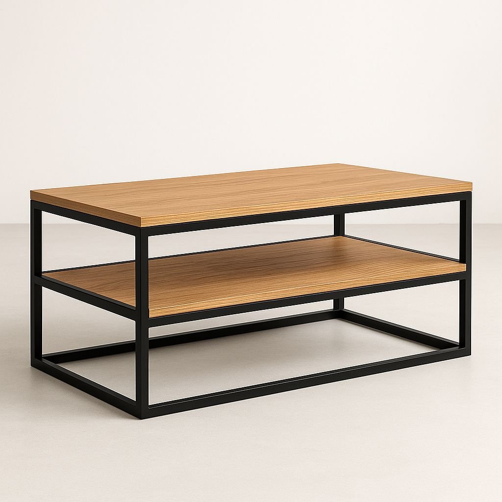 Mesa ratona de diseño industrial con estructura de hierro negro y tapa de madera maciza. Incluye un estante inferior para mayor practicidad.