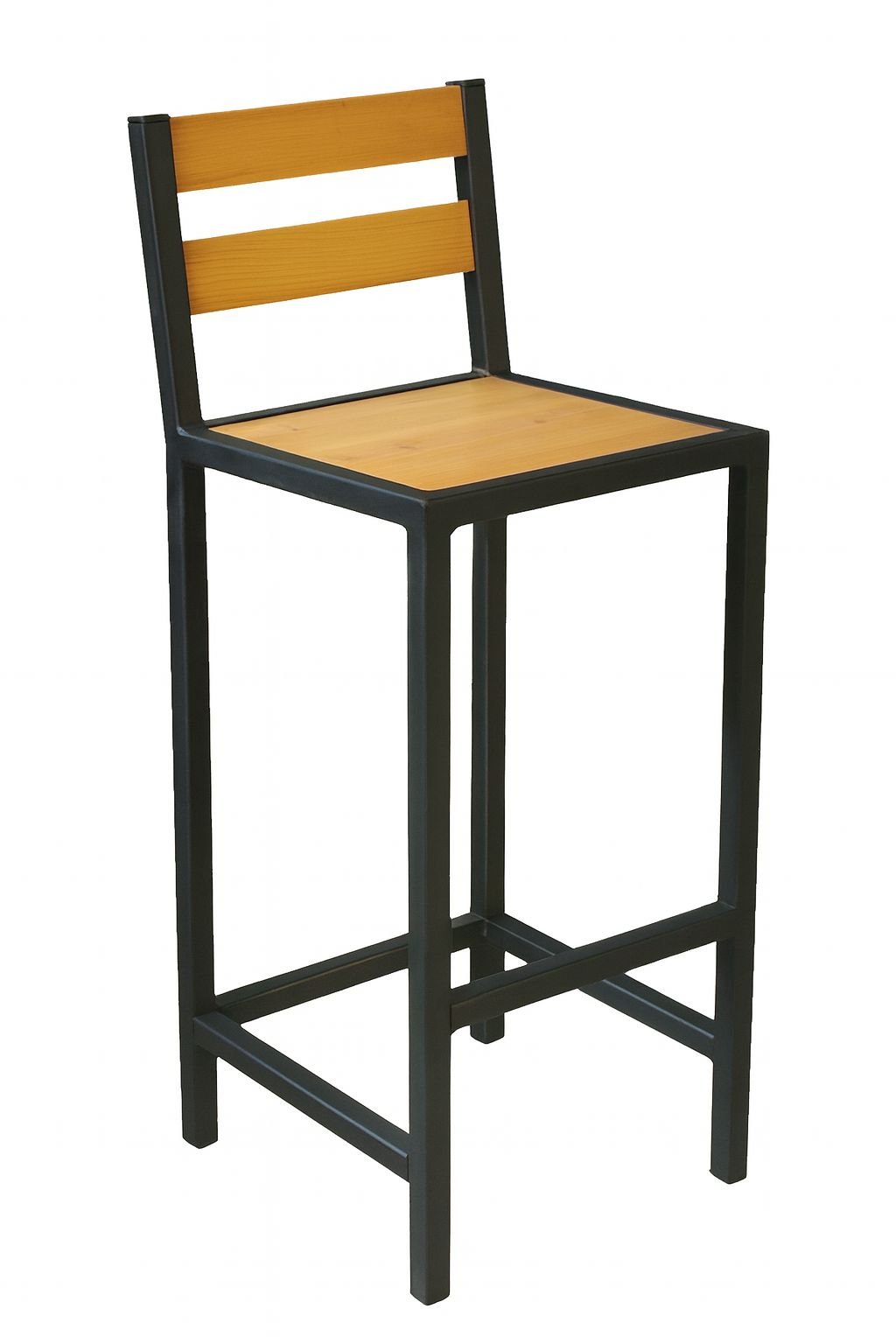 Taburete alto con estructura de hierro y asiento + respaldo en madera maciza. Diseño industrial, resistente y elegante. Personalizable en medidas y con envíos a todo el Uruguay.
