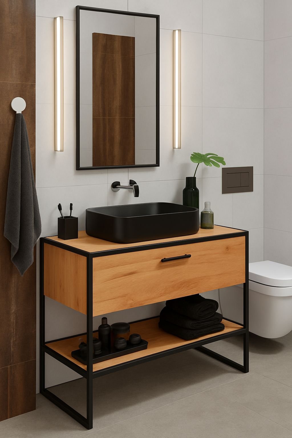 Fabricado en hierro con terminación en pintura horneada y madera maciza, aporta estilo y durabilidad a cualquier baño.